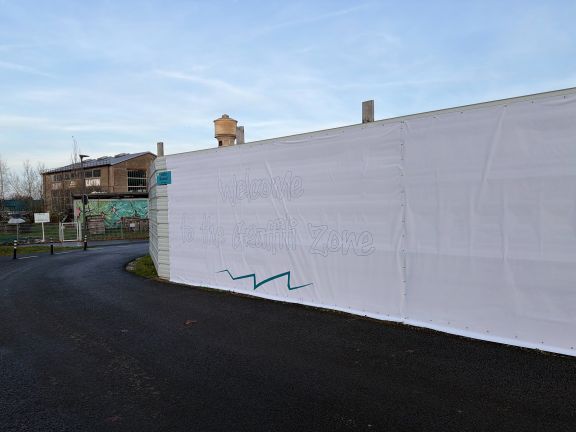 Une « Graffiti zone » sur les bâches du projet « NeiSchmelz » à Dudelange