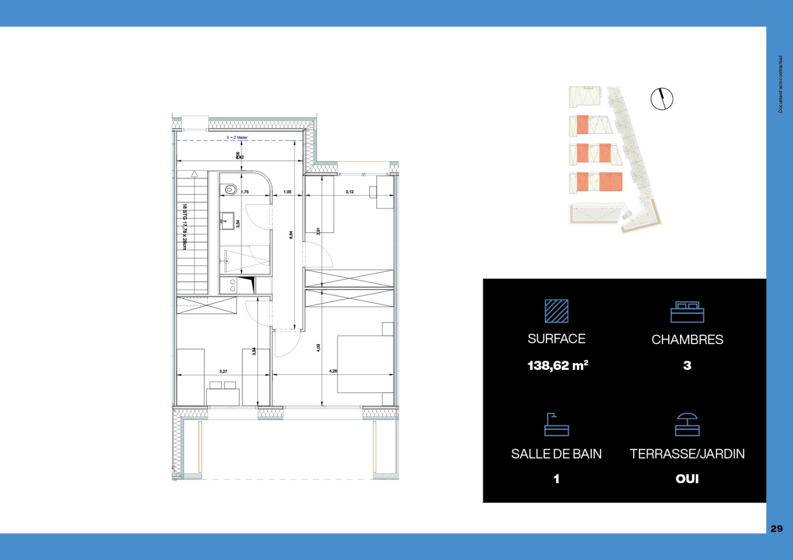 Triplex en vente abordable d’une surface 138,62 m2, construction neuve (2024), comprenant 3 ch-à-c, une salle de douche, un WC séparé, cuisine non équipée ouverte sur séjour, un espace extérieur de 21,61 m2 et un espace de stockage. Terrain sous droit d’emphytéose. Possibilité de louer ou d'acheter un emplacement de parking. Prix TTC : TVA récupérable sous réserve d'approbation des administrations compétentes. Réservé à un ménage avec min de 1 enfant à charge qui répond à la condition d’éligibilité pour un logement abordable/à coût modéré. Conditions, brochure et plans : voir documents sous "TELECHARGEMENTS". Pour plus d’informations veuillez contacter le service vente au 26.26.44-710 ou écrire à «service_vente@fondsdulogement.lu?»